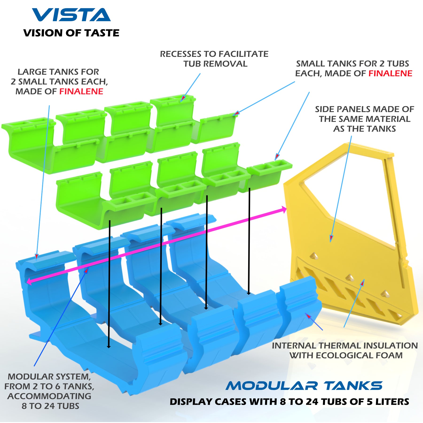 IMPORTANT GAINS IN BUSINESS - Large, small, and side tanks made of finalene, available in multiple colors, deliver unmatched thermal insulation with eco-friendly insulating foam. Aerodynamic large tanks ensure excellent cold distribution. Small tanks are easy to disassemble and wash, with recesses that simplify pan removal. This means faster cleaning, guaranteed contamination-free operation, and energy savings, as external heat cannot easily penetrate these materials.